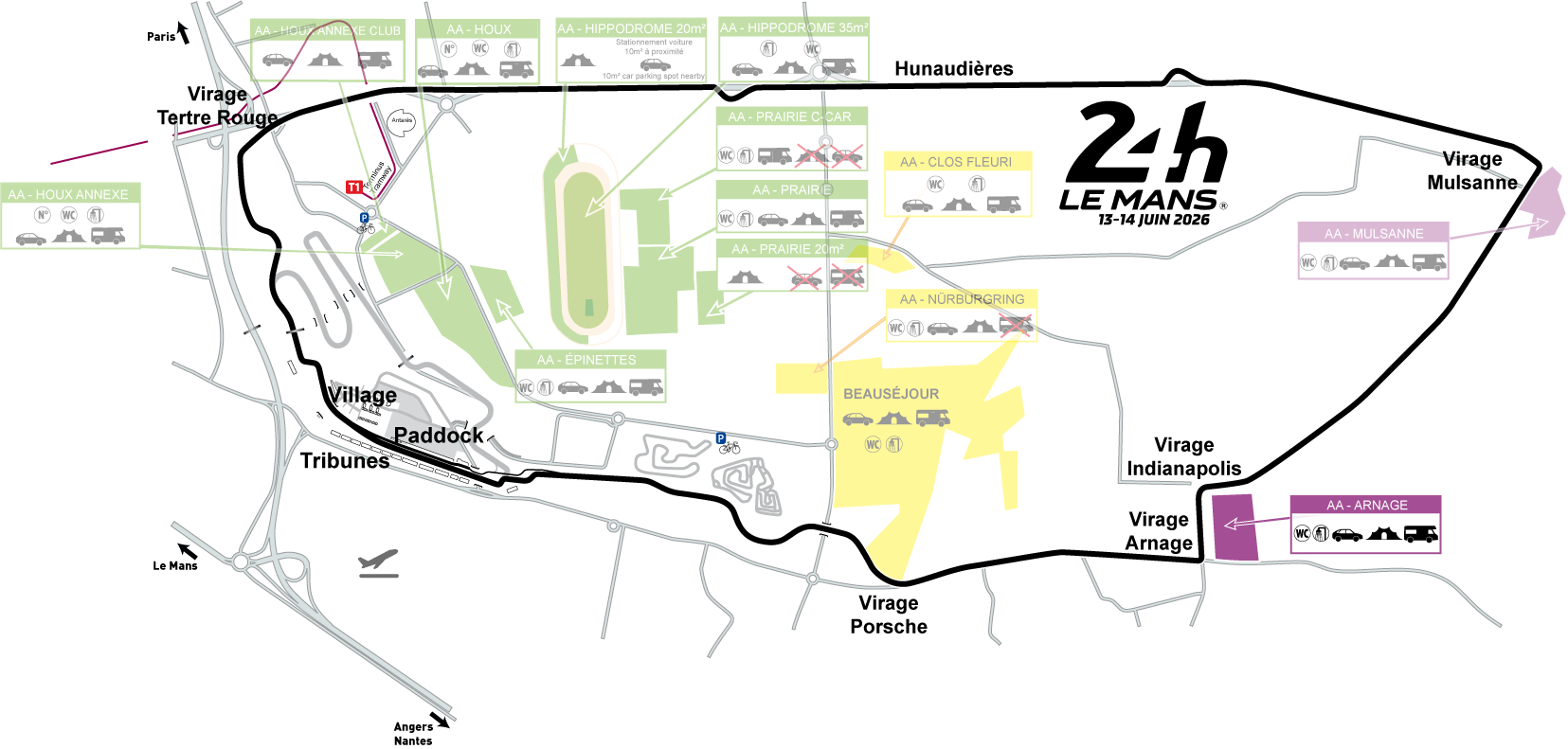 Située le long de la piste au niveau du virage d’Arnage, cette aire d’accueil est accessible aux voitures + tente/caravane ou camping-cars.