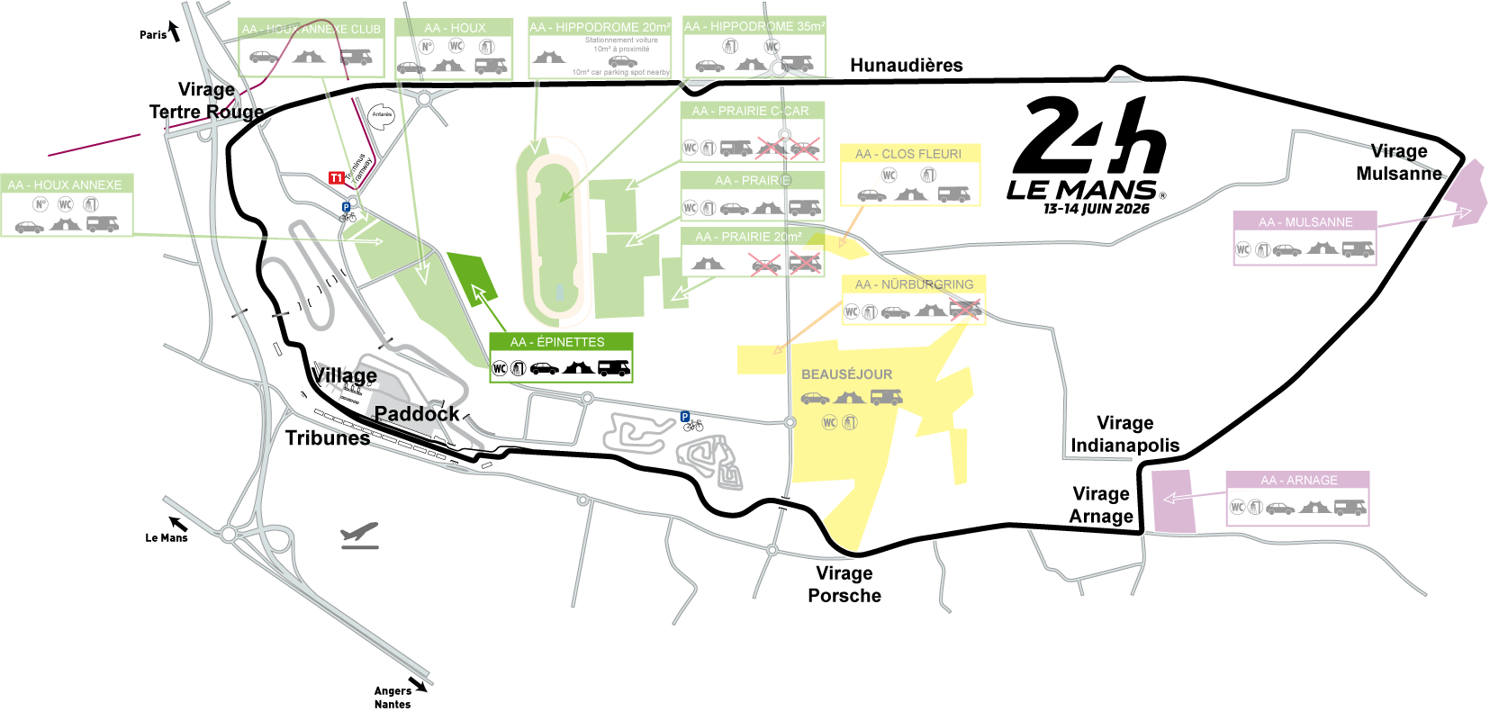 Située au cœur du circuit à proximité du terminus du tramway (Antarès/MMArena), cette aire d’accueil est accessible aux voitures + tente/caravane ou camping-cars et à privilégier si vous souhaitez vous rendre dans la tribune des Stands (34), au Village et dans les Paddocks.