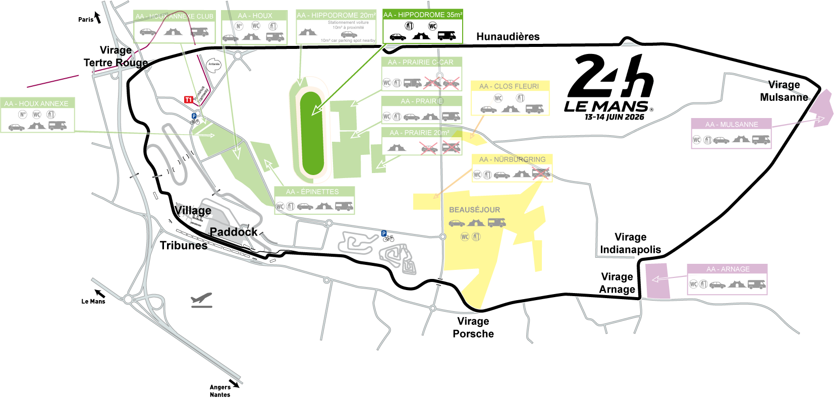 - Prix par véhicule pour un emplacement non numéroté de 35m² (1 billet = 1 véhicule = 35m²).