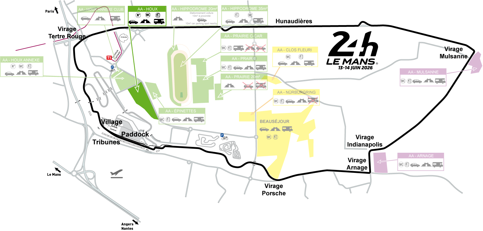 Située au cœur du circuit et à deux pas du terminus du tramway (Antarès/MMArena), cette aire d’accueil boisée est accessible aux voitures + tente/caravane ou camping-cars et à privilégier si vous souhaitez vous rendre dans la tribune des Stands (52), au Village et dans les Paddocks.