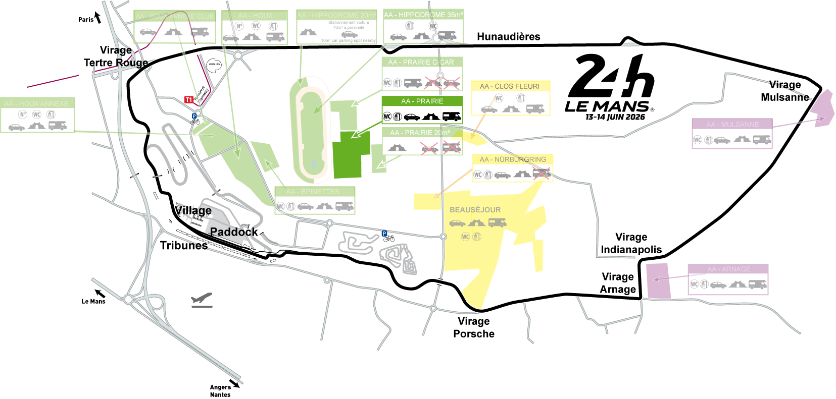 Située à l’intérieur du circuit à proximité de la ligne droite des Hunaudières, cette aire d’accueil est accessible aux voitures + tente/caravane ou camping-cars.